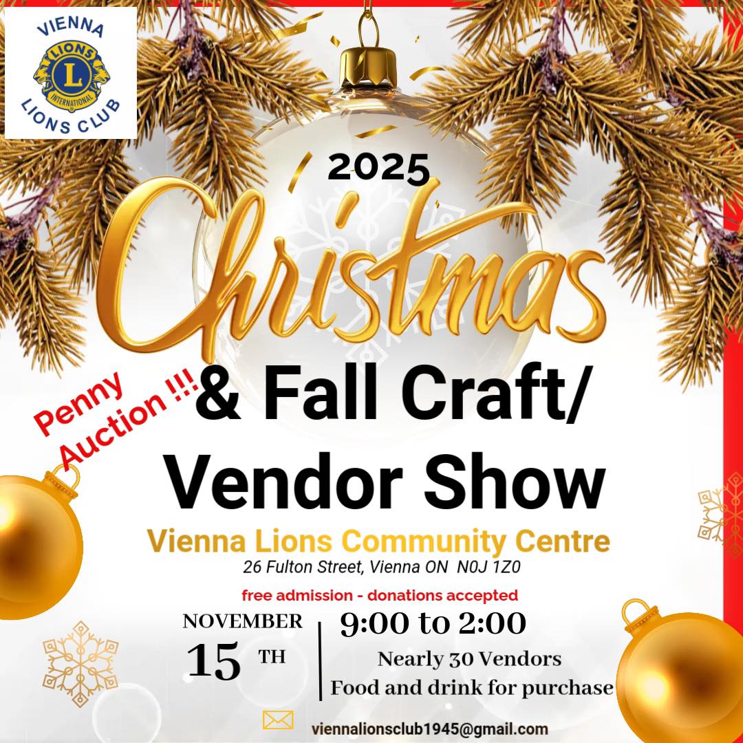 The Vienna Lions Club is hosting a Christmas & Fall Craft/Vendor Show at the Vienna Lions Community Centre, 26 Fulton St in Vienna, on Saturday, November 15, 2025 from 9 am – 2 pm.